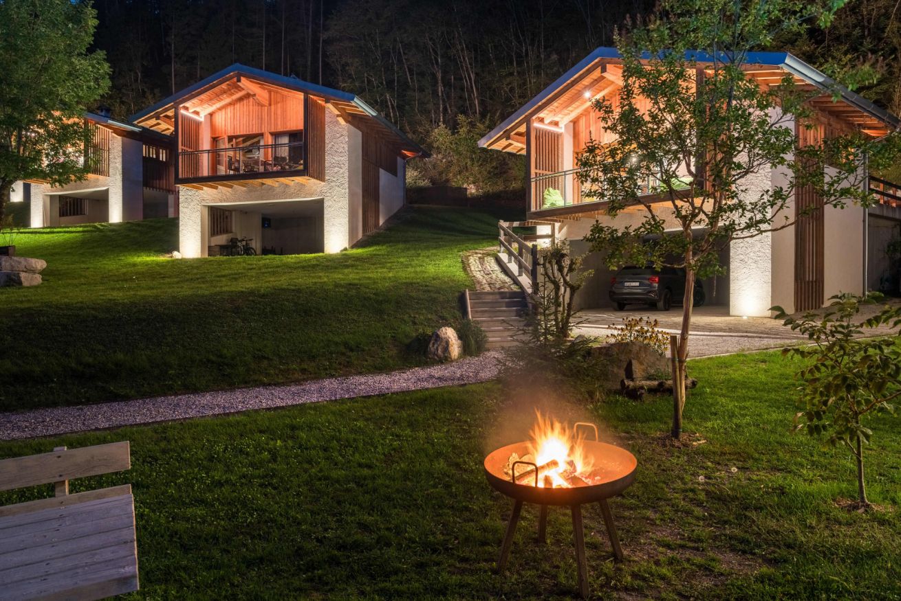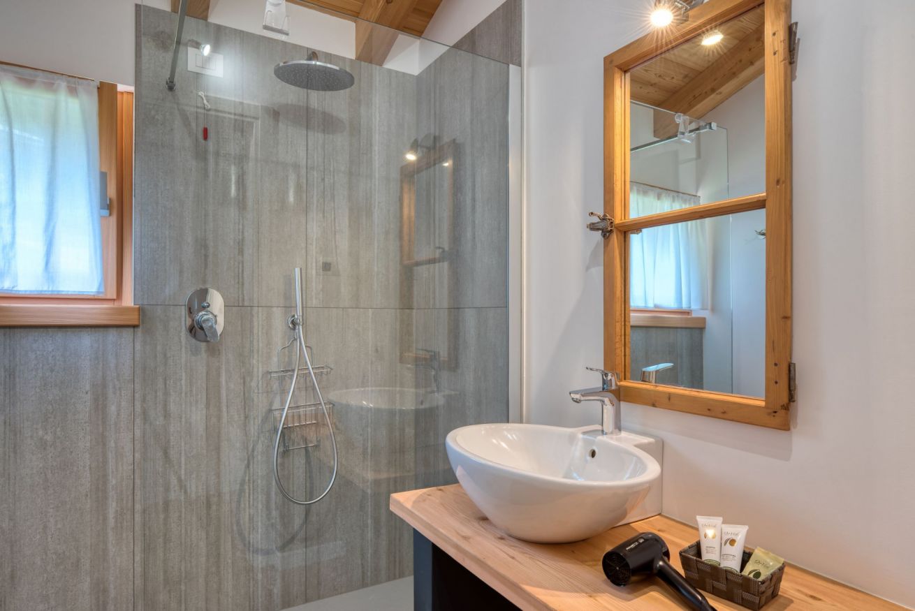 Bungalow indipendente di 50 m², realizzato recentemente in legno e certificato in classe energetica A+. Dispone di due camere da letto per un totale di 4 posti letto, un bagno con ampia doccia in cristallo e una cucina attrezzata con lavastoviglie, piano a induzione, frigorifero con cella freezer, microonde e bollitore.Il soggiorno è dotato di TV-SAT, divano, caminetto a legna e ampia terrazza attrezzata con tavolo e sedie. All’esterno, nel giardino, è disponibile un tavolo con panche. È garantito un posto auto/moto nelle immediate vicinanze del bungalow.