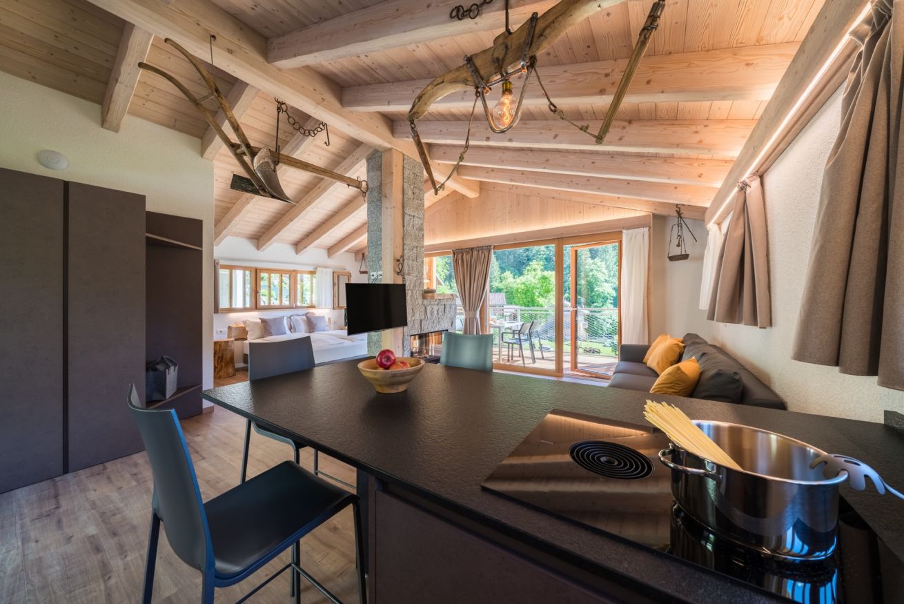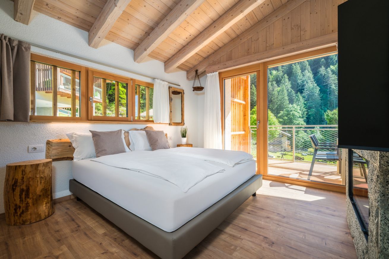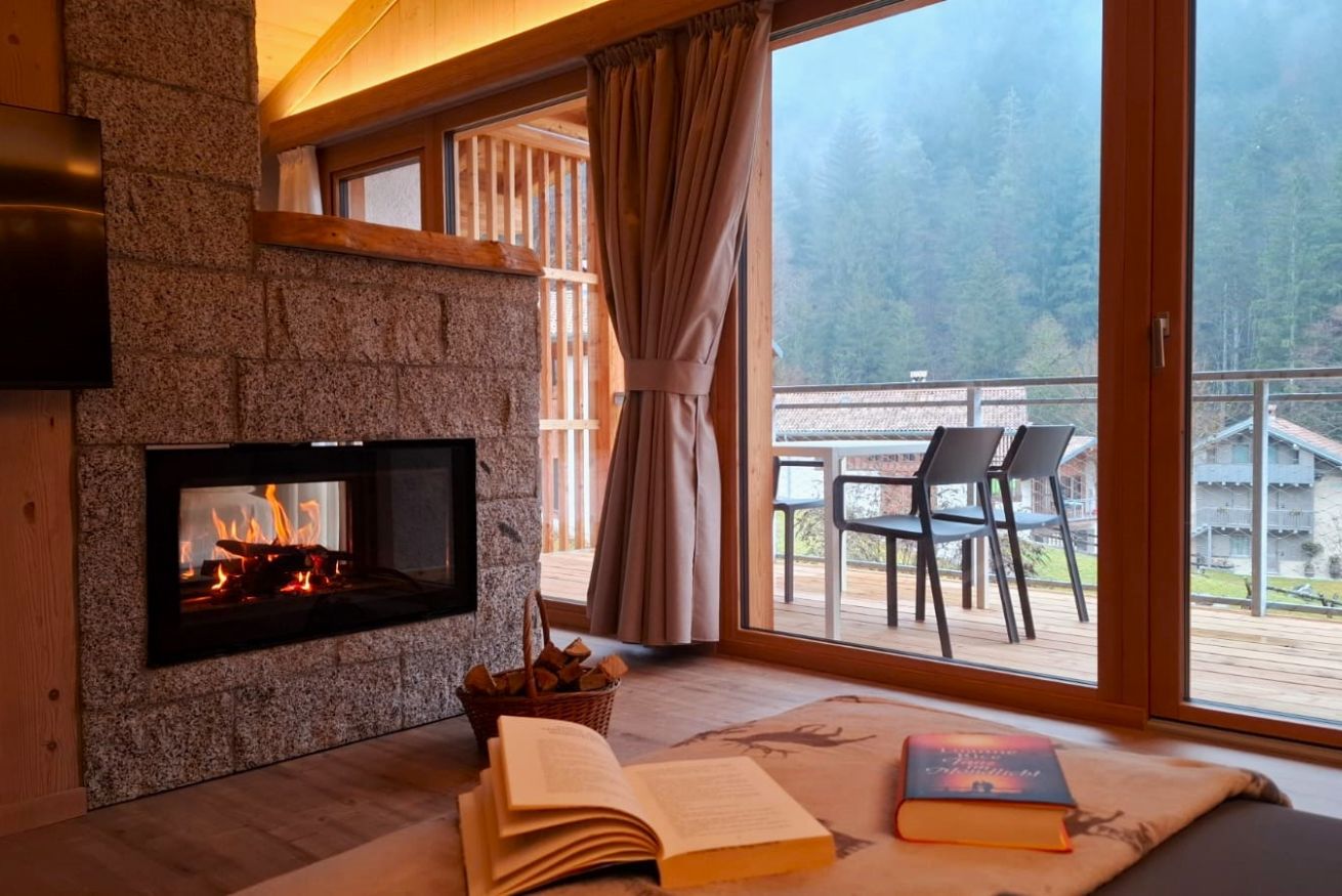 Casa indipendente di nuovissima costruzione, struttura in legno appartenente alla classe energetica A+. L'ambiente open-space trova nel caminetto a legna bifacciale il suo punto focale. Attorno a esso ci sono il letto matrimoniale (per un totale di 2 posti letto) e il divano con penisola. La cucina è dotata di piastra a induzione, forno microonde, lavastoviglie, bollitore, frigorifero con cella freezer e stoviglie. Nello spazio dedicato al soggiorno c'è una Smart TV con impianto satellitare integrato. Nel bagno con doccia sono presenti: asciugamani, accappatoi e asciugacapelli. Sull'ampio balcone con vista giardino c'è un tavolo con sedie. Per gli ospiti a disposizione un posto auto o moto coperto privato e un deposito biciclette chiuso.